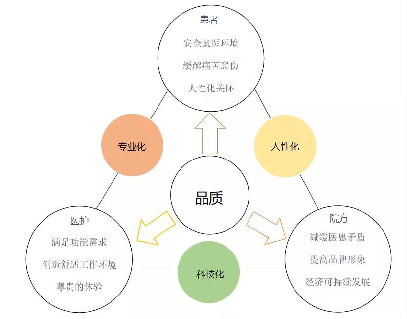 醫(yī)院的最終目的是為病人、家屬以及醫(yī)務(wù)人員提供更好的服務(wù)品質(zhì),好的醫(yī)院室內(nèi)設(shè)計(jì)必須具備“四化”,即專業(yè)化、人性化、科技化和尊貴化,主要通過(guò)公共空間和科室空間兩個(gè)大的方面來(lái)設(shè)計(jì)體現(xiàn)。
