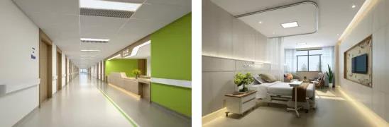 主要包括護(hù)士站、診室、治療室、病房及病房衛(wèi)生間等區(qū)域,這些區(qū)域在平面布局上注重便捷的功能排布;在裝飾材料選擇上要注意具備吸音降噪、抗菌耐污、耐擦洗的特征;在采光照明上要求防眩光、高顯色,注意漫反射光與直接照明相結(jié)合。