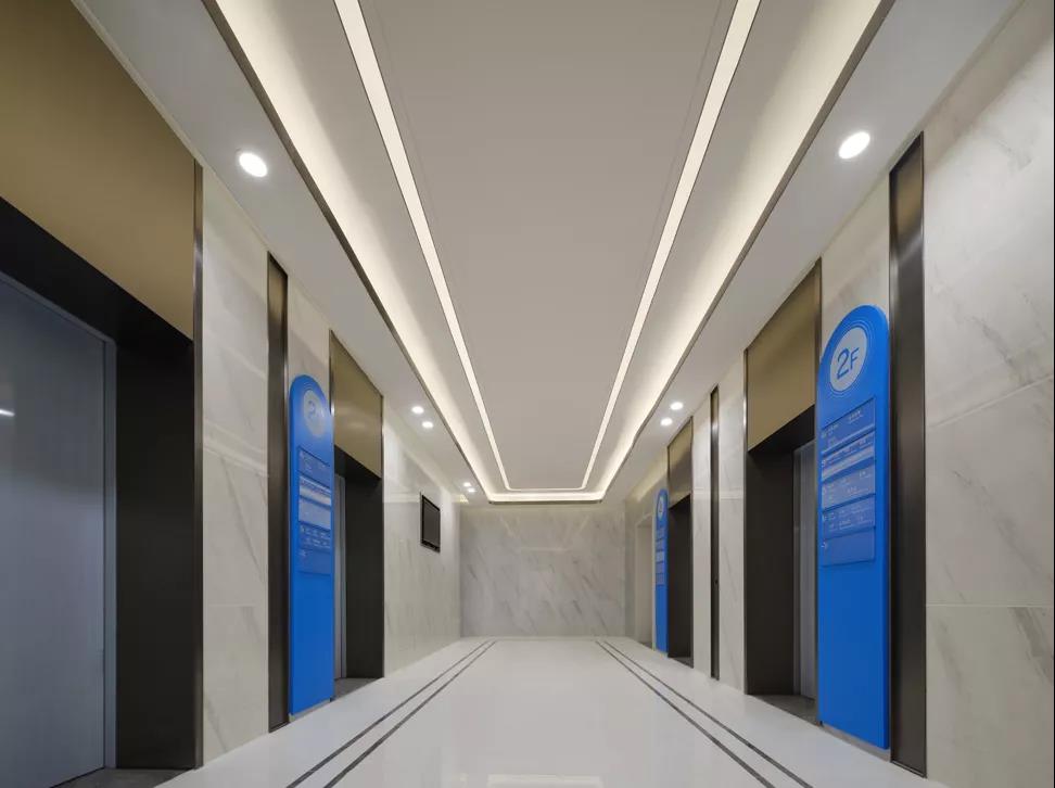 ▲ 圖45 人性化/專業(yè)化/尊貴化:醫(yī)技樓電梯廳采用易于引導(dǎo)標(biāo)識(shí)系統(tǒng)、防炫光暗藏?zé)艄狻⒉捎檬暮筒讳P鋼材質(zhì)品質(zhì),體現(xiàn)空間品質(zhì)感特性