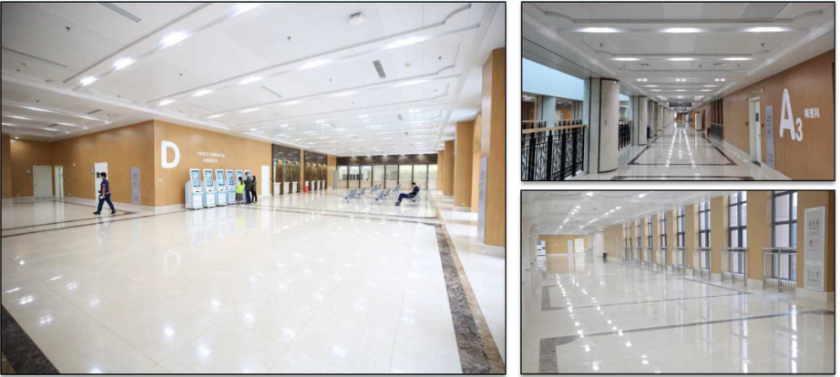 鋁板吊頂,質感高端,干凈整潔,耐腐蝕性好,耐久性好,公共部位考慮人員比較集中,采用沖孔鋁板降噪吸音。玻化磚質地堅硬、抗壓耐磨性能優越,釉面光澤、易于清潔維護,PVC地膠采用同質透芯,質地柔和,耐磨防水性好,易于清 潔保養。公共區域墻面冰火板墻面裝飾紋路清晰、色彩溫馨,質地堅硬,A級防火,防撞防污。45根大理石圓柱做工考究,材質堅硬,亮麗光澤、莊重典雅,整體裝飾風格協調、效果美觀。